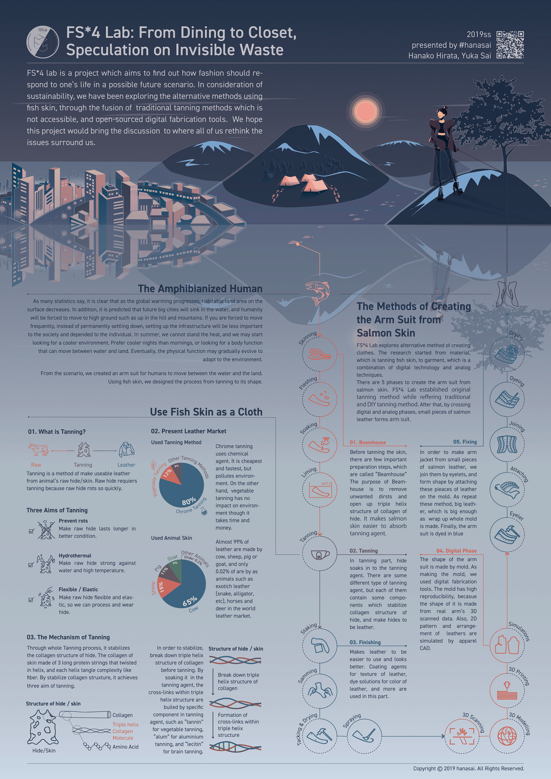FS*4 Lab is a project which aims to find out how fashion should respond to one's life in a possible future scenario. In consideration of sustainability, we have been exploring the alternative methods using fish skin, through the fusion of traditional tanning methods that is not accessible, and open-sourced digital fabrication tools. We hope this project would bring the discussion to where all of us rethink the issues surround us.